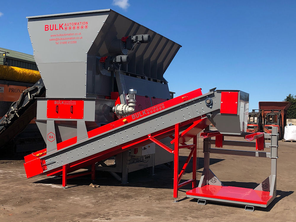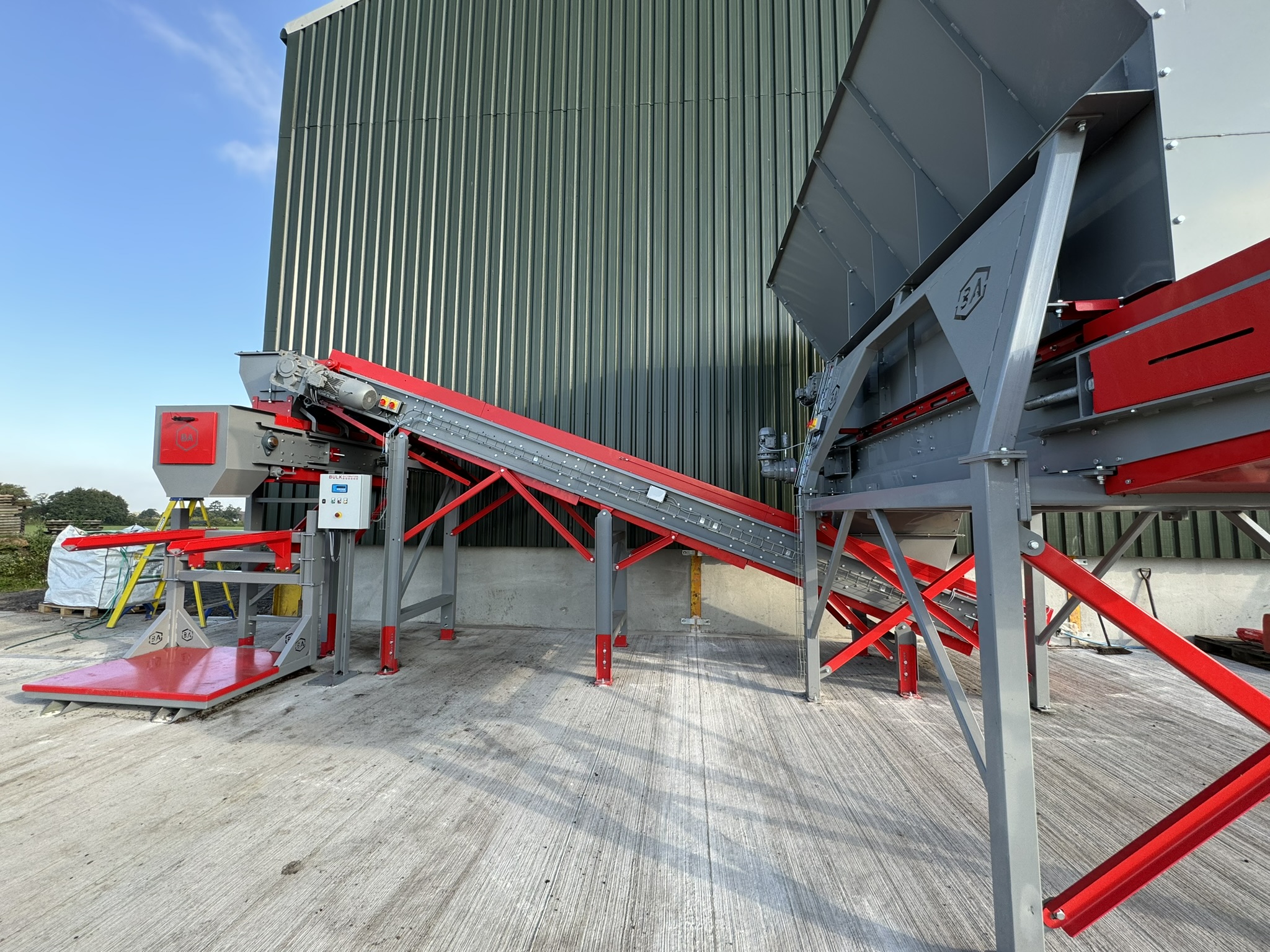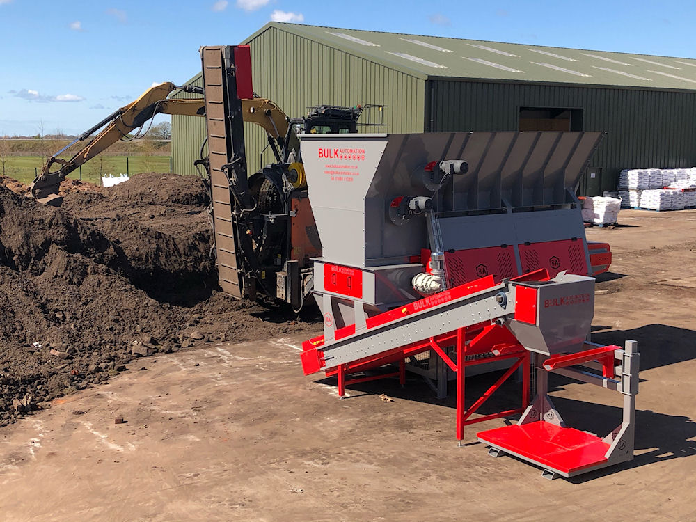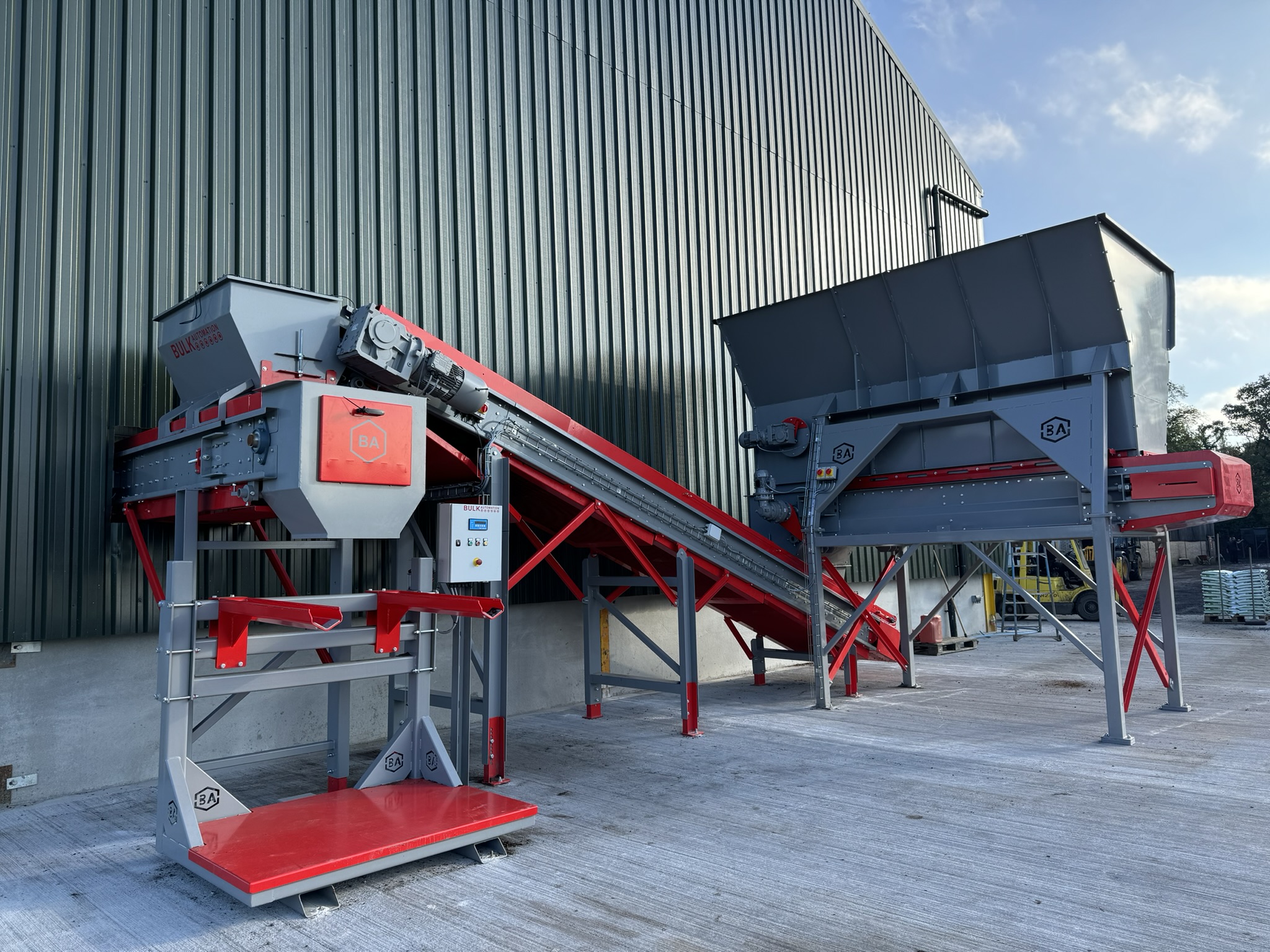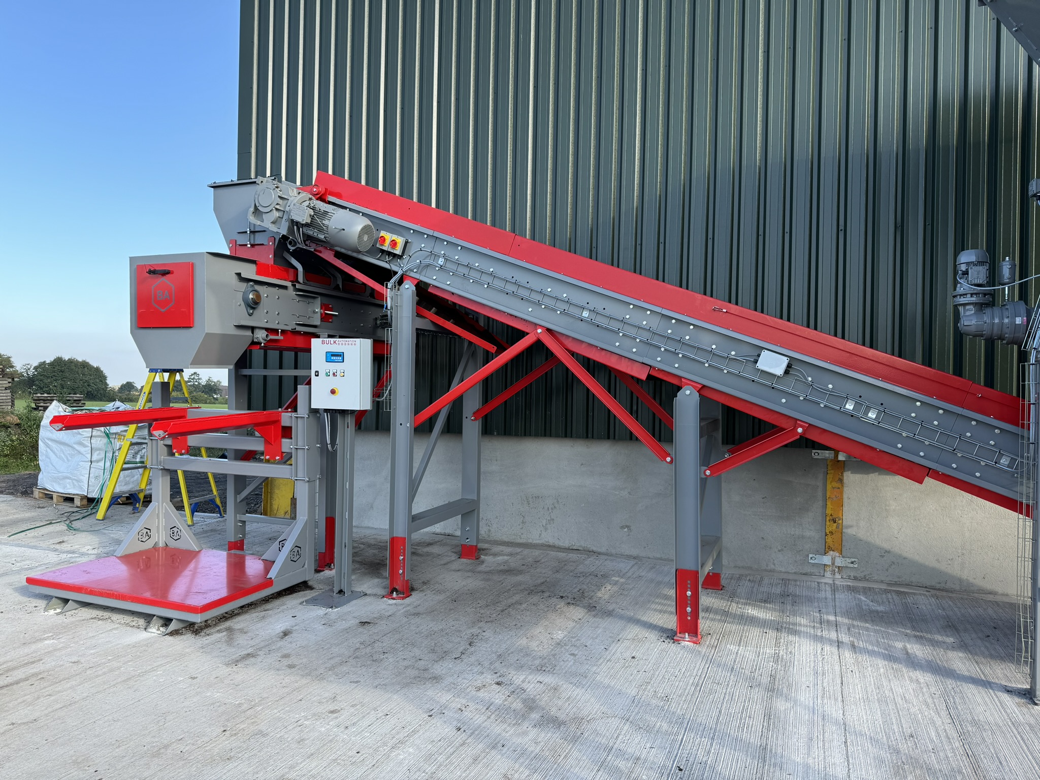 The BAB-180C Compost Bulk Bagging systems is a specialized machine designed for packaging compost, topsoil, and other Growing Media products such as mulch and bark. This system features a straight-sided hopper with a wide flat belt below that feeds the product onto the infeed conveyor for bag filling.